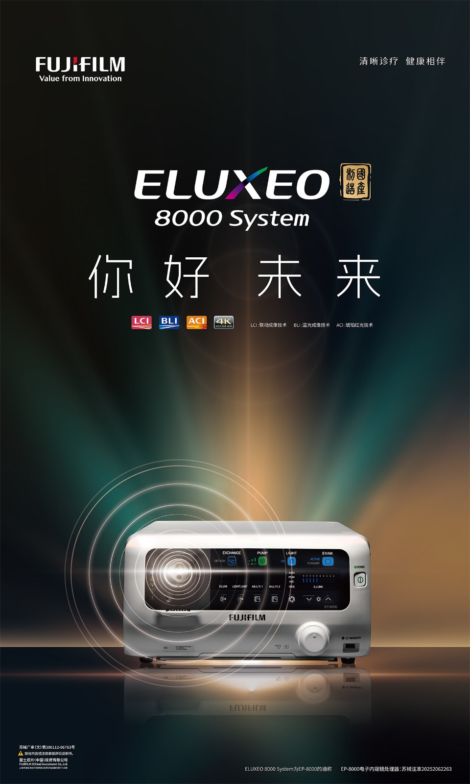 富士胶片内镜产品始终关注与贯彻世界卫生组织"早发现、早诊断、早治疗"的癌症防治策略,致力于为消化道早期癌症的诊疗提供助力。本次推出的内窥镜系统——ELUXEO 8000,是"ELUXEO"系列的新一代旗舰一体机,标志着富士胶片在内镜诊疗领域的最新突破。该系统可与去年底发布的富士胶片电子上消化道内窥镜EG-840T和EG-840TP配合使用,为消化道疾病治疗提供新的整体解决方案。