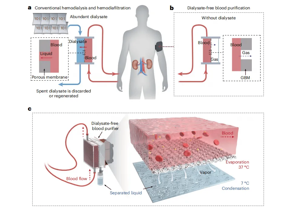 Conventional dialysis is difficult to miniaturize because it relies on liquid-liquid exchange and requires 120 to 150 liters of dialysate per session. The new device replaces flushing with evaporation. At its core is a dialysate-free blood purifier built around gas-permeable, blood-repellent membranes, or GBMs. Water is separated through a gas-pressure-driven liquid-gas phase transition, while uremic toxins are removed through adsorption.