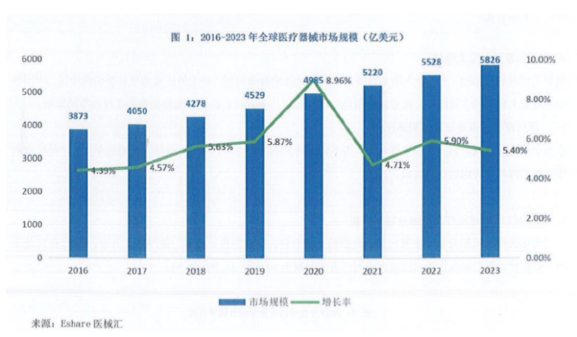 据Eshare医械汇测算,2023年全球医疗器械市场规模为5,826亿美元,同比增长5.40%。同时,国家政策推动医疗器械行业不断升级,产品创新迭代加快。从区域来看,欧美日等发达国家和地区的医疗器械产业发展时间早,对医疗器械产品的技术水平和质量要求较高,市场需求以产品升级换代为主,市场规模庞大,增长稳定。而以中国为代表的新兴市场是全球最具潜力的医疗器械市场,产品普及需求与升级换代需求并存,近年来增长速度较快。