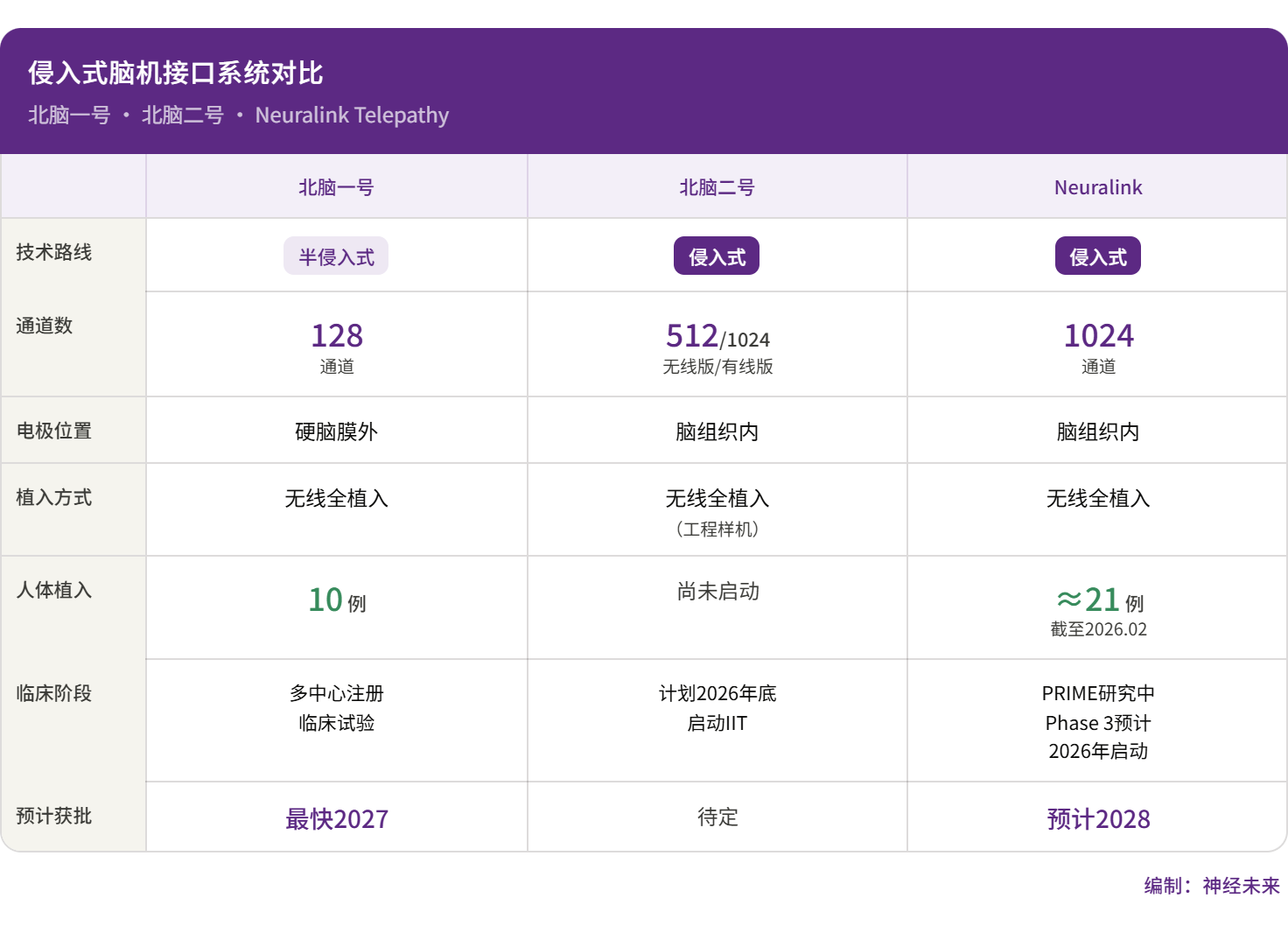 半侵入式赛道上,北脑一号的最大竞争对手是博睿康的NEO系统。据公开报道,博睿康已在全国11家医院完成超过30例植入,累计安全植入天数近5000天,近期将向NMPA提交三类创新医疗器械注册申请。2026年4月,NMPA批准了全球首款侵入式脑机接口医疗器械上市("植入式脑机接口手部运动功能代偿系统"),尽管该产品采用硬脑膜外微创路线,但其获批本身意味着中国监管层面已为植入式BCI建立了审评先例,后续产品的注册路径将更加清晰。