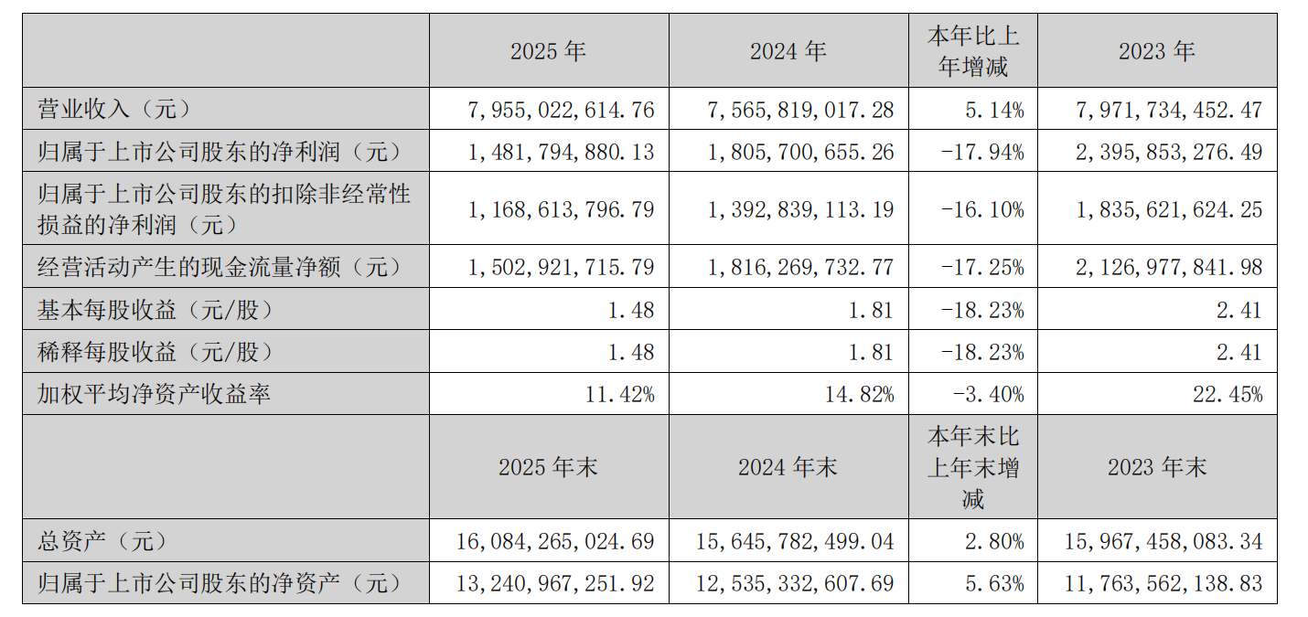 2025年度,鱼跃医疗实现营业收入79.55亿元,同比增长5.14%;归属于上市公司股东的净利润14.82亿元,同比下降17.94%;扣非净利润11.69亿元,同比下降16.10%。经营活动产生的现金流量净额15.03亿元,同比下降17.25%。基本每股收益1.48元/股,加权平均净资产收益率11.42%。截至2025年末,公司资产总额160.84亿元,同比增长2.80%;归属于上市公司股东的净资产132.41亿元,同比增长5.63%。资产负债率16.97%。利润分配预案为每10股派发现金红利6.00元(含税),不送红股,不以公积金转增股本。
